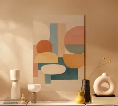 Geometric shapes and earthy tones create a modern design with abstract lines and forms. The composition includes overlapping rectangles and a semi-circle, highlighted by gold accents.