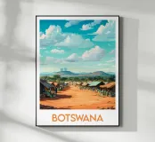 Cette affiche du Botswana met en valeur un marché traditionnel animé au cœur d’un paysage africain aux couleurs chaudes. Avec ses étals bordant une large piste ocre et son ciel spectaculaire, elle évoque la vie locale authentique et la richesse culturelle du pays.