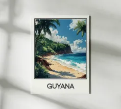 Ontdek een droomstrand in Frans Guyana, omzoomd met weelderige palmbomen en een sprankelende turquoise zee. Dit tropische tafereel roept sereniteit op met zijn groene kliffen en gouden zand. Een uitnodiging om te kalmeren en te ontsnappen in een natuurlijke hoek van het paradijs.