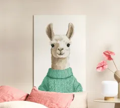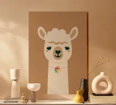 Een witte lama met zwarte oren en neus draagt een kleurrijk gestreepte sjaal in rood, oranje, geel en turquoise. Met een lichte glimlach en gesloten ogen staat hij op een gestructureerde oranje ondergrond voor een gedeelde geel-turquoise achtergrond - charmant en speels.