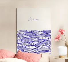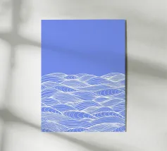 Zeichnung von weißen Wellen auf blauem Grund. Darunter der Schriftzug Amare Mare - Waves - Modern Art Exhibition.