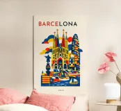 A vibrant, graphic celebration of Barcelona, brought to life through bold geometry and energetic colour blocking. Iconic architectural forms rise in layered harmony, blending historic landmarks with the city’s unmistakable creative spirit. Playful shapes, rhythmic patterns, and confident contrasts give the composition movement and warmth, capturing Barcelona’s expressive character without relying on fine detail.