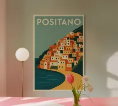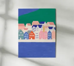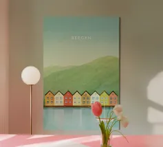 "Architectuurtekening ontmoet reisposter in art-decostijl."