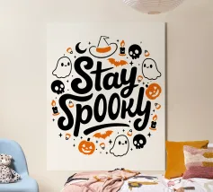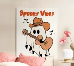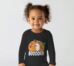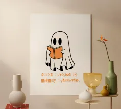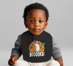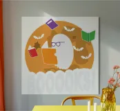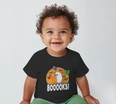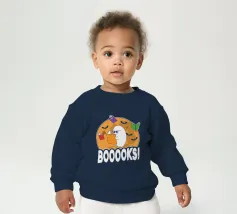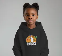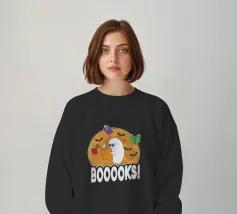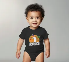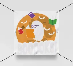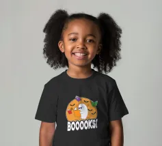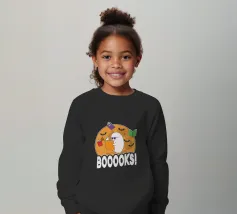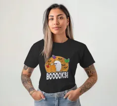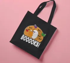 Een cartoonspook met bril leest een oranje boek, omringd door vliegende boeken en vleermuizen voor een grote maan. Het woord "BOOOOKS!" staat er vet onder en voegt een griezelige maar humoristische sfeer toe.