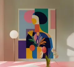 Een conceptueel modern portret waarin een menselijk silhouet samensmelt met bloemenelementen en doorschijnende geometrische vormen. Deze artistieke compositie roept een fusie op van gedachten, natuur en introspectie, waardoor het een opvallend stuk is voor minimalistische interieurs of creatieve ruimtes.