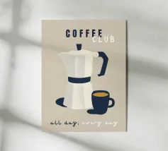 Black and white illustration with moka pot, beans and "Caffè?" lettering. Clean design with a retro touch, perfect for coffee lovers and modern kitchen walls.