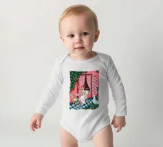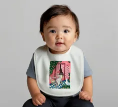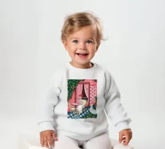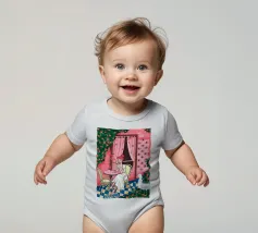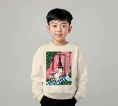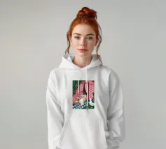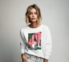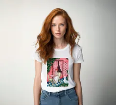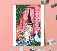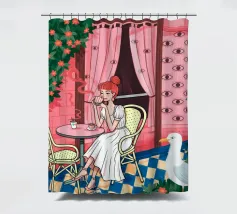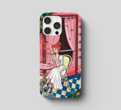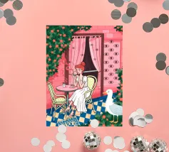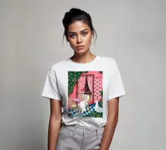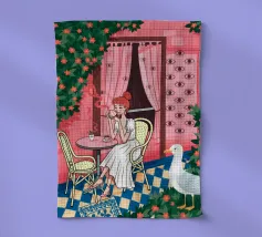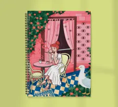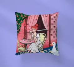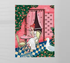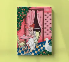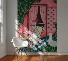 A charming Cafe scene where a woman sits at a table surrounded by pink walls, vibrant flowers, and lush greenery. The ambiance exudes warmth and artistic flair.