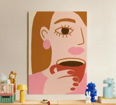 Een stijlvolle illustratie van een modieuze vrouw met zonnebril en hoepeloorbellen, die een afhaalkoffie vasthoudt, weergegeven in een heldere, op pop-art geïnspireerde stijl.