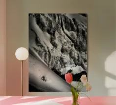 Ervaar de sensatie van alpine avontuur met deze prachtige "Chamonix" poster, die de adembenemende toppen van een van 's werelds meest iconische skibestemmingen laat zien. Het gewaagde diagonale ontwerp toont een skiër in de lucht, zwevend door de dramatische achtergrond van ruige besneeuwde bergen en stormachtige wolken. Deze monochrome compositie roept zowel de majesteit als de uitdaging van de Alpen op. Deze poster is perfect voor skiliefhebbers, avonturiers of liefhebbers van berglandschappen en brengt de geest van Chamonix in je interieur. Deze poster is ideaal voor thuis, op kantoor of in een hut en is een eerbetoon aan de schoonheid van de Alpen.
