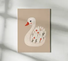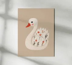 Een sierlijke kleine zwaan wordt afgebeeld in een zacht profiel, met een elegante gebogen nek en een vriendelijke uitdrukking die een rustige en hartverwarmende uitstraling creëert. Met een warme oranje snavel, roze wangen en fijn gestructureerde veren straalt de zwaan zowel charme als sereniteit uit. Deze zwaanwanddecoratie is perfect voor kinderkamers, babykamers of op de natuur geïnspireerde kinderruimtes en brengt elegantie, zachtheid en een rustige sfeer in elk interieur.