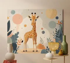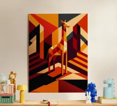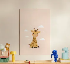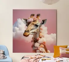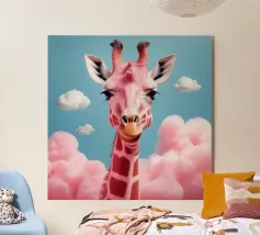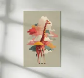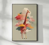 Een speelse en dromerige illustratie van een grote giraffe die oprijst boven een grillige lucht vol zachte, kleurrijke wolken. Het retro-moderne kleurenpalet in warm rood, geel en crème creëert een serene en fantasierijke sfeer - perfect voor een kinderkamer of een creatieve werkruimte. Gedrukt in hoge resolutie voor verbluffende details en visuele impact.