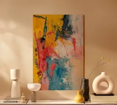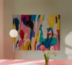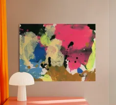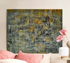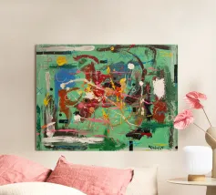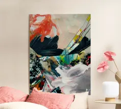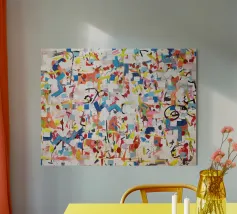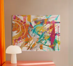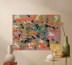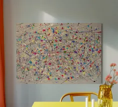 Dit abstracte acrylschilderij vangt de dynamische energie van de action painting-techniek, geïnspireerd door Pollock. Levendige kleurspatten in rood, geel, blauw en wit creëren vloeiende lijnen en complexe patronen die beweging en diepte overbrengen.