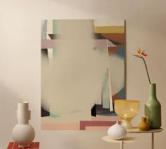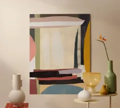 Dit kunstwerk toont een abstracte compositie met gebogen lijnen en vormen, weergegeven in zachte kleuren zoals beige, bruin en blauw. De compositie is sierlijk en vloeiend en roept een gevoel van beweging en elegantie op.