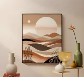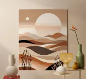 Deze minimalistische abstracte landschapskunst vangt de essentie van een serene woestijnscène. Zachte, aardse tinten komen harmonieus samen en creëren een rustgevende en uitnodigende sfeer. De zachte rondingen van de glooiende heuvels en de subtiele texturen roepen een gevoel van rust en vrede op. Perfect om een vleugje door de natuur geïnspireerde elegantie toe te voegen aan elke ruimte.