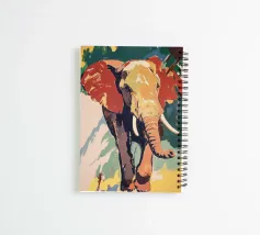 Een gedurfd en kleurrijk schilderij van een olifant die met zijn slurf omhoog op een vlakke ondergrond staat tegen een achtergrond van groene bomen. Het kunstwerk is geschilderd met grote penseelstreken, waardoor het dynamisch aanvoelt en beweging en energie benadrukt. Het heeft heldere kleuren zoals rood, geel, groen en blauw, waardoor een contrast ontstaat tussen licht en donker en details zoals textuur en vorm worden benadrukt.