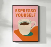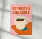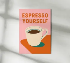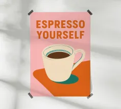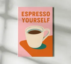 Espresso Yourself is een charmante mix van woordspelingen en design en nodigt je uit om te genieten van zelfexpressie door middel van cafeïne en kleur. Een crèmekleurig koffiekopje met groenblauwe schetsaccenten zit bovenop een fel oranje schaduw, tegen een zachtroze achtergrond. Het contrast van warme en koele tinten, samen met de handgetekende texturen, geeft het stuk een speels en opbeurend karakter. Deze print is ideaal voor keukens, cafés of creatieve hoekjes en geeft elke blik persoonlijkheid.