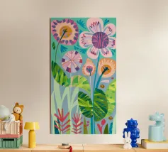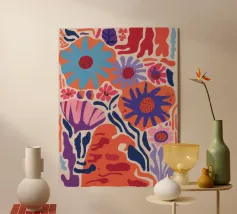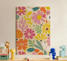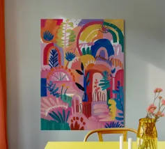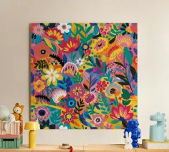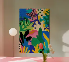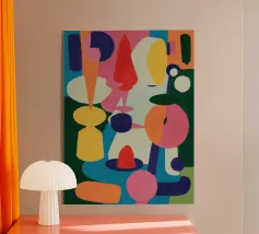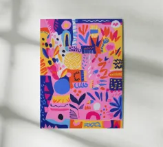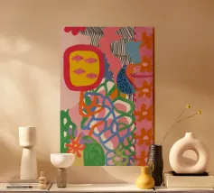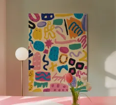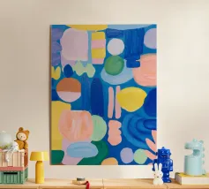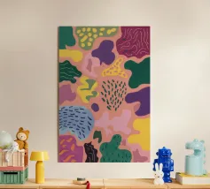 Een levendige en speelse abstracte compositie met een reeks organische, klodderachtige vormen in fel blauw, roze en geel. De spontane vormen en energieke kleuren creëren een gevoel van vreugdevolle artistieke expressie.