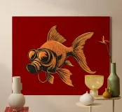 Een levendige illustratie in retro-stijl van een oranje vis met een duikbril en snorkel, weergegeven met krachtige lijnen en ingewikkelde details. De gestileerde vis heeft een speels en surrealistisch ontwerp dat ideaal is voor creatieve projecten of concepten met een aquatisch thema.