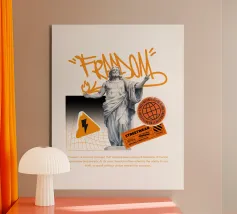 Produktbeschreibung: Das Motiv kombiniert eine klassische Statue mit modernen Elementen wie auffälligen Schriftzügen, bunten Aufklebern und dem Highlight-Schriftzug „Dreedom“. Diese kraftvolle Mischung aus traditioneller Kunst und Street-Style verkörpert Kreativität, Freiheit und einen rebellischen Geist. Perfekt für alle, die ihren individuellen Stil auf innovative Weise zeigen möchten. Details: Designstil: Moderne Street-Art trifft auf klassische Ästhetik – eine kontrastreiche Fusion aus Tradition und Urbanität. Farben: Vielseitige Farbpalette mit Akzenten Botschaft: Freiheit für alle.