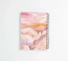 Sfeervolle illustratie van een roze en gouden zonsondergang met wollige wolken en een heteluchtballon.