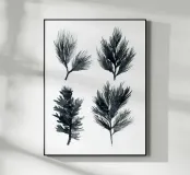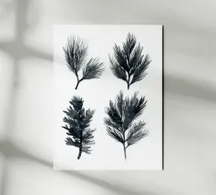 Een gedurfde collectie van vier studies van dennentakken weergegeven in rijke zwarte inkt en gelaagde wassingen. Elk silhouet verkent een ander gebaar en een andere penseeltechniek, waardoor de essentie van het altijd groene gebladerte wordt vastgelegd in een minimalistische, expressieve stijl. Ideaal voor moderne interieurs, op de natuur geïnspireerde decoraties of botanische kunstbundels.