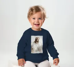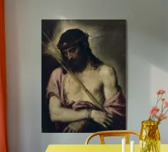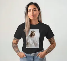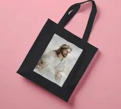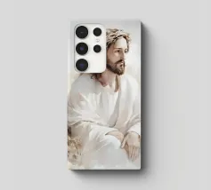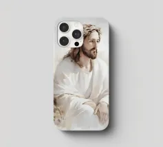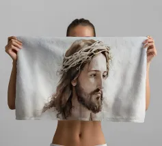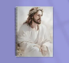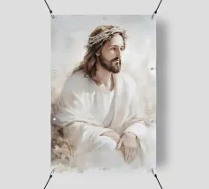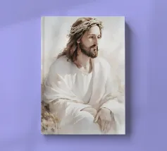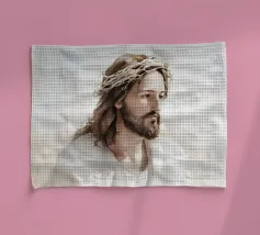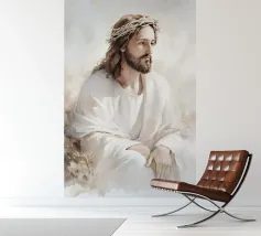 Een serene afbeelding van een bedachtzame man met lang haar en een baard, die een wit gewaad en een doornenkroon draagt. De zachte verlichting en zachte uitdrukking creëren een vredige en reflectieve sfeer.