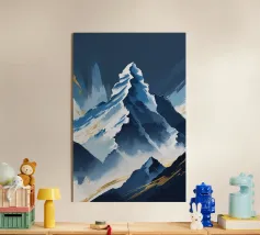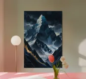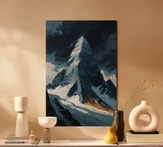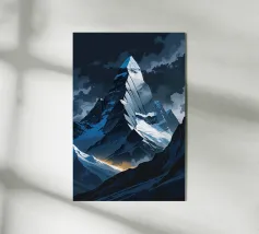 Deze visueel aantrekkelijke afbeelding van K2 maakt gebruik van gedurfde hoekige vormen die de ruige geometrische contouren van deze torenhoge top nabootsen. De berg, gehuld in een donkere, stormachtige lucht, trekt de aandacht met zijn gekartelde randen en verlichte bergkammen, waardoor een dramatisch contrast van licht en schaduw ontstaat. De gouden accenten langs de voet van de hellingen voegen een opvallende dimensie toe en symboliseren een pad door de chaos. Deze artistieke benadering maakt van K2 een abstract monument van de onverbiddelijke kracht en pracht van de natuur.
