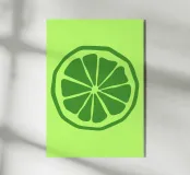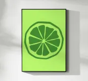 Een gestileerde groene limoen met krachtige, strakke lijnen steekt af tegen een lichtgroene achtergrond. Het eenvoudige ontwerp benadrukt de partjes en schil van de limoen.