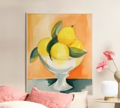 Een fris, levendig stilleven met een keramieken vaas gevuld met bladerrijke citroentakken. Met zijn warme tinten en minimalistische achtergrond brengt dit kunstwerk mediterrane charme en natuurlijke schoonheid in elke keuken of woonruimte.