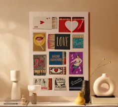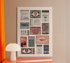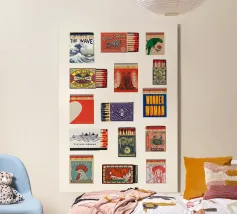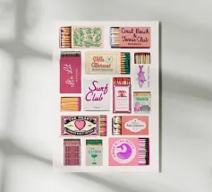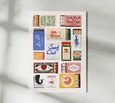 Een kunstige mix van vintage luciferdoosjes van iconische cafés, restaurants en kustplaatsen. Dit ontwerp straalt retro charme uit en doet denken aan road trips, koffietentjes en visrestaurants aan zee. Ideaal voor iedereen die houdt van typografie, designgeschiedenis en de magie van kleine dingen - perfect voor keukens, galeriemuren of creatieve werkruimtes.