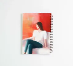 Een minimalistisch lifestyleportret dat een rustig moment van reflectie vastlegt. Warme rode en zachte perziktinten contrasteren met koele schaduwen en omlijsten een zittende, naar binnen gekeerde figuur. Expressieve penseelstreken suggereren bedachtzaamheid, pauze en emotionele diepte - een moment van luisteren naar jezelf. Dit kunstwerk brengt warmte en introspectieve rust in moderne, Scandinavische of doordachte interieurs.