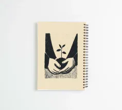 Twee zwart getekende handen houden voorzichtig een jonge plant vast. Minimalistisch en contrastrijk op een lichtgekleurde achtergrond, combineert de compositie bescherming, groei en stille zorg. Een grafische expressie van natuur, balans en zorgvuldige verbinding.