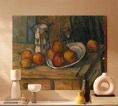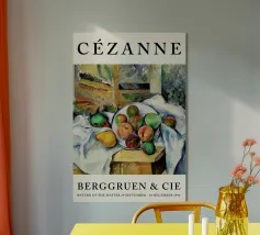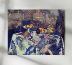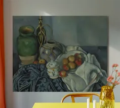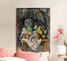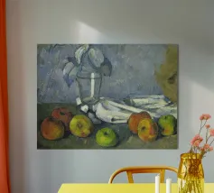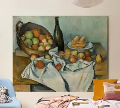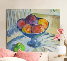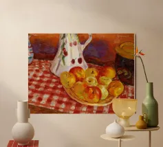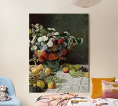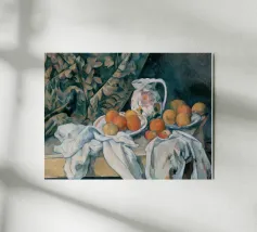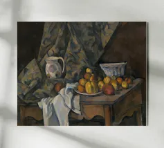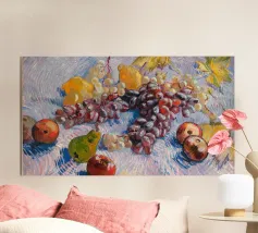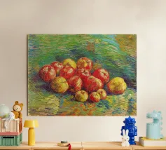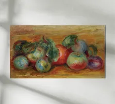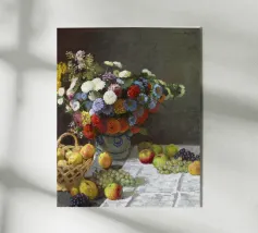 Een charmant stilleven van de impressionistische meester Claude Monet, dat de stille elegantie van alledaagse voorwerpen laat zien. Een rustiek arrangement van appels en druiven op een witgeklede tafel, badend in zacht, natuurlijk licht Geeft de vluchtige schoonheid van gerijpt fruit weer met losse penseelstreken en warme herfsttinten Afwijkend van Monets beroemde landschappen - dit intieme werk is binnenshuis geschilderd tijdens slecht weer Een tijdloos en rustgevend kunstwerk, perfect voor keukens, eetkamers of elk ander gezellig interieur Ideaal cadeau voor kunstliefhebbers, chef-koks of mensen die van rustieke en stillevens houden