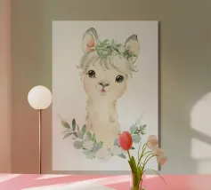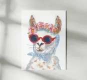 Het motief toont een charmante lama met een rode zonnebril, een blauwe hoofdtooi en een krans van roze bloemen. De fijne penseelstreken en zachte pastelkleuren geven de illustratie een humoristisch en toch elegant karakter. Een speels kunstwerk dat levensvreugde en stijl combineert met een twinkeling in de ogen.