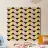 Geometrische patronen herhalen zich in een symmetrisch ontwerp, met driehoeken en rechthoeken in zwart, geel en roze. De gestructureerde opstelling creëert een visueel opvallende en ordelijke compositie.