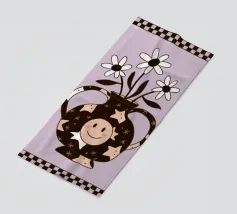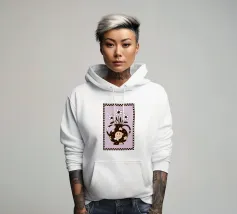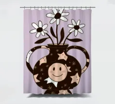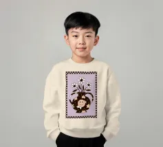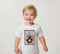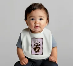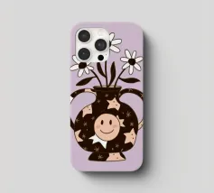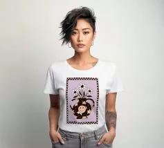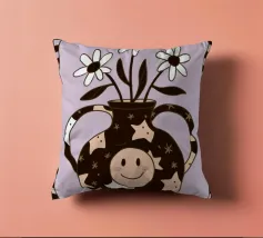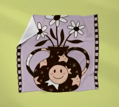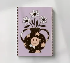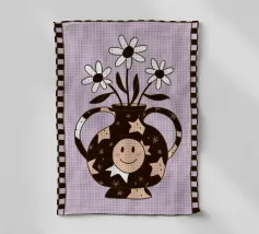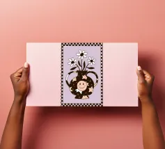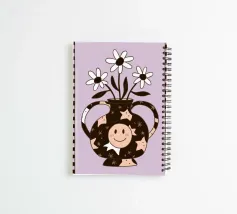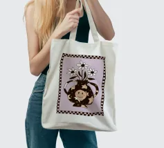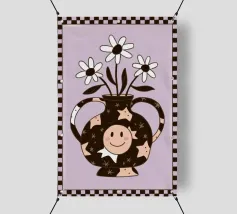 Een grillige illustratie van een aap die op het hoofd van een vrouw zit, die een vaas met bloemen vasthoudt. De scène is een speelse, surrealistische en charmante weergave van een chaotisch en leuk moment.