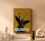 Retro Poster. München, Siegessäule, vintage, retro, grafische Kunst, Stadt, Reise, Illustrationen, Urlaub, Flugzeug, pop art, Büro, Kinderzimmer, Wohnzimmer, Schlafzimmer, Küche, gold, türkis