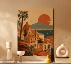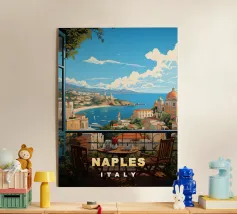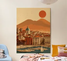 Minimalistisch Italiaans ontwerp met de beroemde vulkaan Vesuvius en de stad Napels op de voorgrond. Typisch Zuid-Italiaans landschap met de Middellandse Zee en vrij kaal, droog zomerlandschap en iconische berg.
