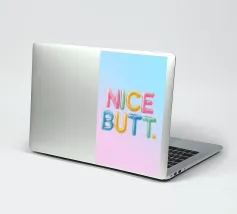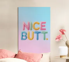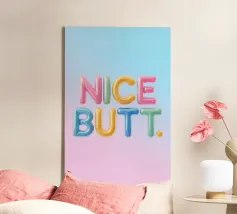 "Nice Butt" in kleurrijke pastelletters met een speelse, schattige uitstraling op een effen achtergrond. Humoristisch, charmant ontwerp met een esthetische stijl en moderne typografie.