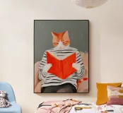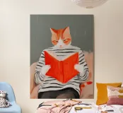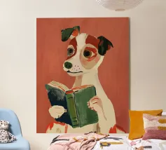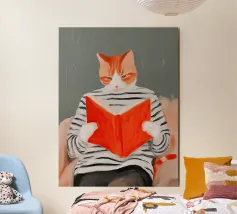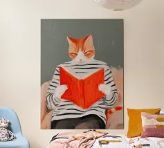 Een contemplatief portret van een kat verzonken in een levendig rood boek, geschilderd met zachte, expressieve streken. De scène is een balans tussen stille humor en introspectie en suggereert nieuwsgierigheid, geduld en de subtiele frustratie van het zoeken naar betekenis. Kalm en bedachtzaam legt dit kunstwerk een moment vast waarop vragen blijven hangen - en stilte een deel van het antwoord wordt.