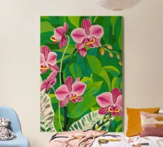 Delicate en elegante orchideeënbloemen met gedetailleerde bloemblaadjes in roze, gele en paarse tinten, tegen een achtergrond van brede groene bladeren, die hun verfijnde schoonheid vastleggen.
