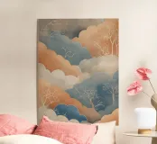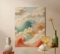 Dit etherische kunstwerk nodigt je uit om te ontsnappen naar een wereld van rust en verwondering. De zachte tinten van het wolkenlandschap creëren een gevoel van vrede, terwijl de delicate silhouetten van de bomen een vleugje mysterie toevoegen. Laat je verbeelding de vrije loop terwijl je naar dit serene tafereel kijkt, waar de lucht de aarde ontmoet in een harmonieuze mix van kleuren en texturen.