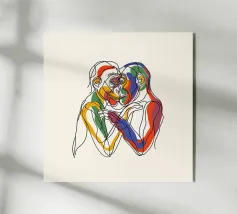 Een gestileerde abstracte compositie met overlappende vormen in levendige kleuren, die de indruk wekken van een zittend persoon. Het gedurfde gebruik van blauw, rood, oranje en groenblauw creëert een dynamisch gevoel van beweging en vorm.