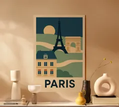 "Architectuurtekening ontmoet reisposter in art-decostijl."