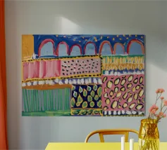 Een lappendeken van verschillende patronen, waaronder lijnen en U-vormen, in levendig geel, blauw, roze en rood, creëert een kleurrijk mozaïekeffect in dit abstracte werk.