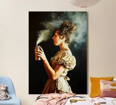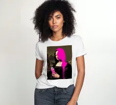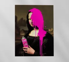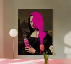 "Pink Soup" is the unexpected yet perfect blend of two opposing art worlds that, surprisingly, complement each other. Renaissance art, with its meticulous detail and classical perfection, comes face to face with the bold irreverence of pop and urban art. Here, the iconic Mona Lisa, tired of her perpetual exposure, takes control and paints herself in a striking fuchsia, a rebellious act against her eternal image.