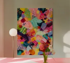Energieke vormen in roze, koraal en karamel creëren een vrolijke compositie geïnspireerd op retro boho-design. Levendig en vol persoonlijkheid.