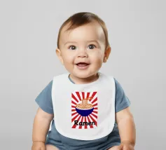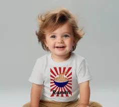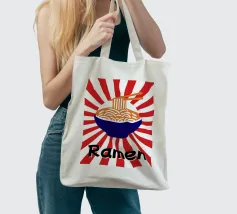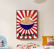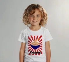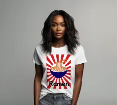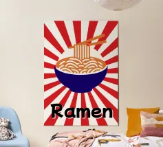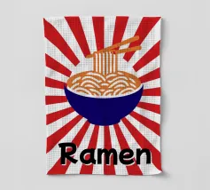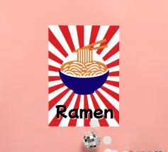 Een kom noedels is afgebeeld met stokjes die enkele slierten optillen tegen een achtergrond van rode en witte stralen. Onderaan staat met vette zwarte tekst "Ramen", wat een speels tintje toevoegt.