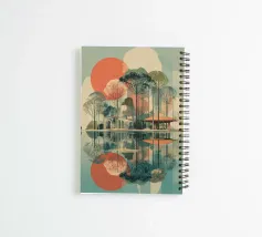 Een serene, geometrische reisposter met abstracte architectuur en hoge bomen die weerspiegeld worden in stilstaand water. Deze compositie is geïnspireerd op modernistisch design en mengt zachte pasteltinten met gedurfde vormen voor een meditatieve, dromerige sfeer. Perfect voor liefhebbers van minimalistische esthetiek en rustige natuurscènes.