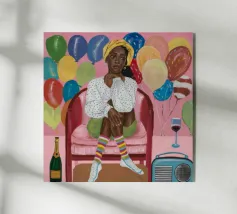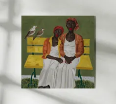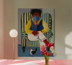Dit kunstwerk toont een persoon die op een gestreepte stoel zit, omringd door zonnebloemen en een groene tas. De achtergrond is gedempt bruin en creëert een rustieke en reflecterende sfeer.